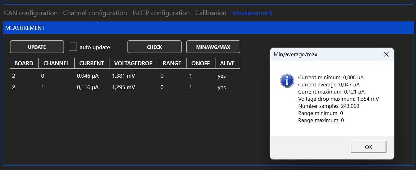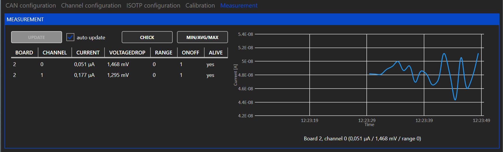 If auto update is enabled the chart on the right shows the current of the channel selected under "BOARD/CHANNEL".