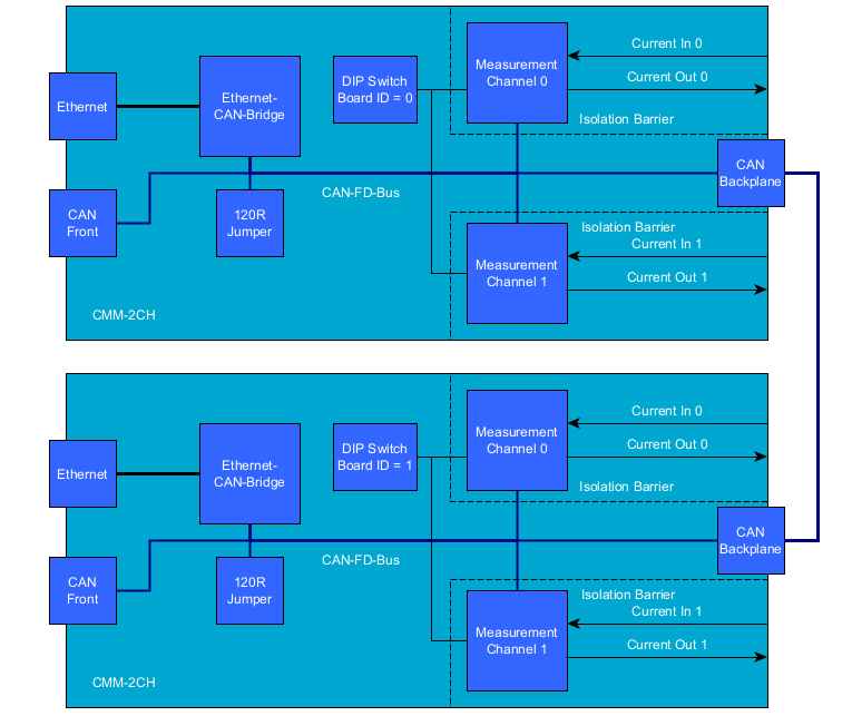 The CMM-xCH modules are equipped with an Ethernet-CAN-Gateway and independent microcontrollers for each measurement channel. CAN-FD is used to communicate between the gateway and the channels.