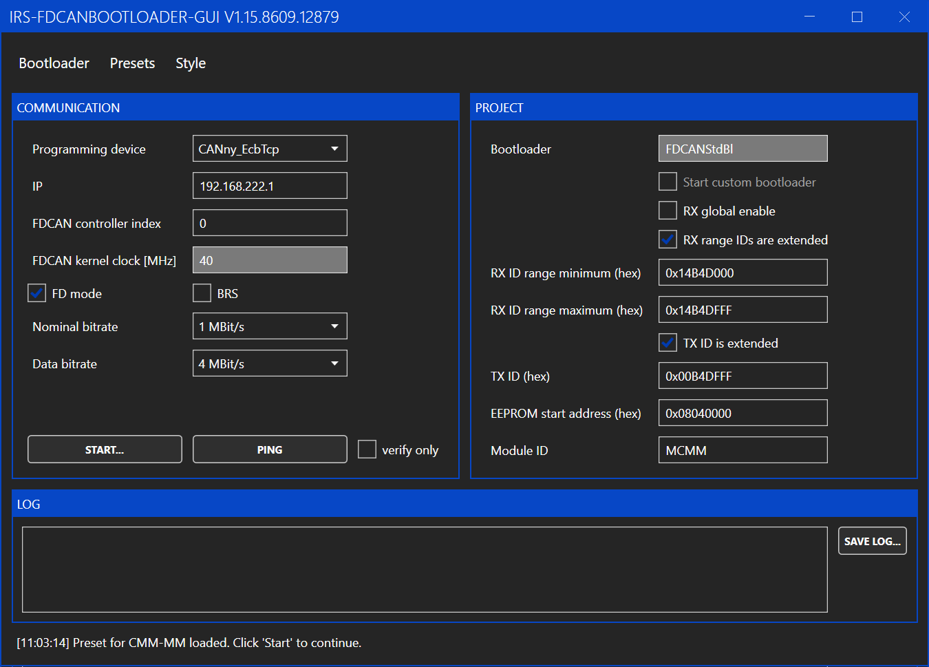 You only need to enter the IP address of the module and then click "START". The rest of the settings should be preset to the correct values. If the settings were changed, you can reload the default values by clicking "Presets -> CMM-xCH".