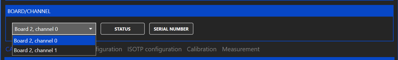 When the Board IDs are set correctly, you can use the Ethernet-CAN-Gateway of any board to communicate with all connected boards. In the GUI click the dropdown menu under "BOARD/CHANNEL to see a list of all detected channels and to select the channel which shall be used. The channel IDs are fixed to 0 and 1 and can not be changed. The channels are marked on the PCB with "Channel 0" and "Channel 1".