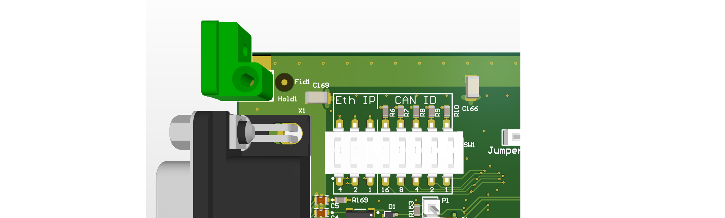 As an alternative you can configure the IP address in a limited range with the DIP switch on the PCB. The switches are treated as a binary number and marked with their place value (1, 2, 4). Depending on the set binary number an IP address between 192.168.222.1 and 192.168.222.7 is used. If all three switches are "off" the IP address configured with the DiscoveryTool is used. The switches are read at power up. So after changing the switches a power cycle is required.