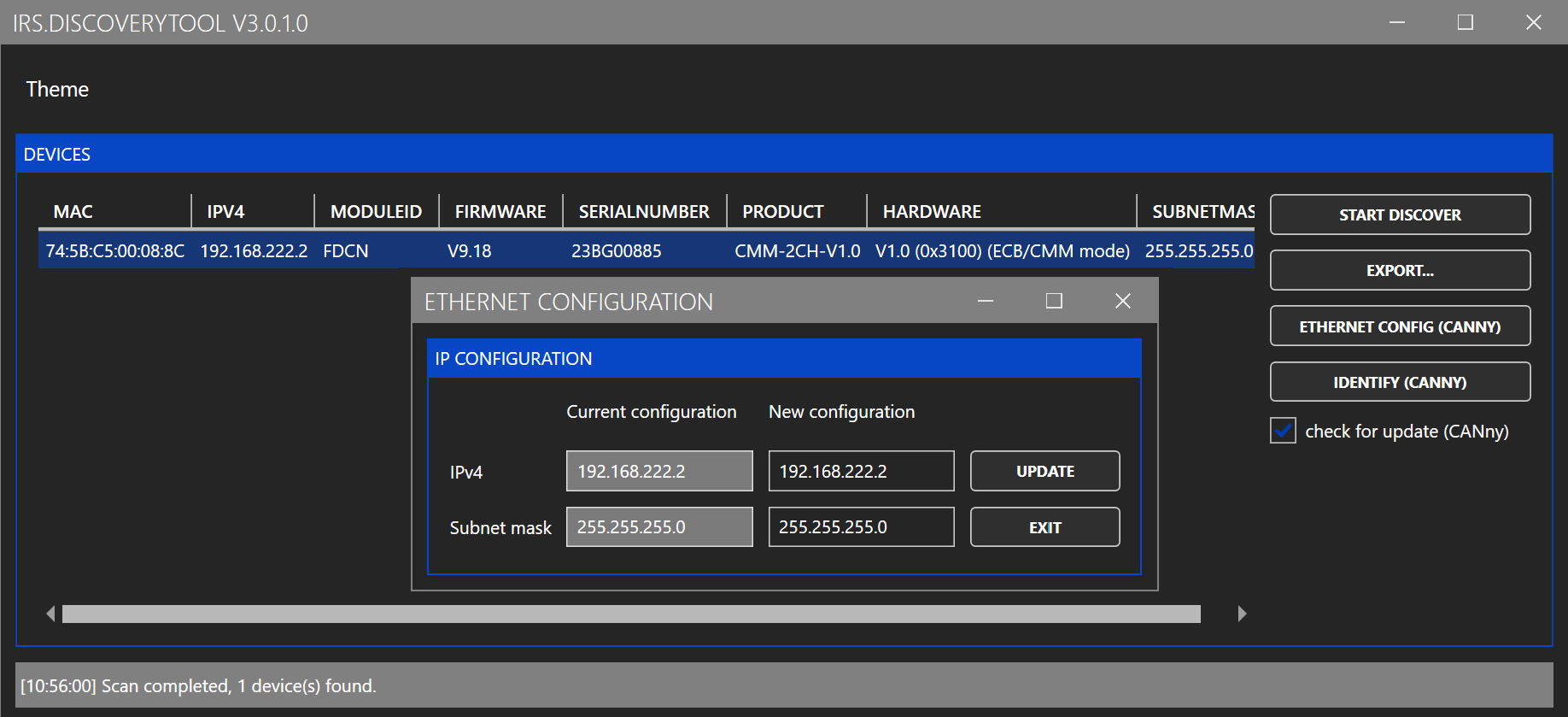 To change the IP address of the module, use "Tools -> DiscoveryTool". In the DicoveryTool first click "START DISCOVER". After 10 seconds a list of all connected modules is shown. Select the module you want to change and click "ETHERNET CONFIG". In the following window you can enter the new IP address and click "UPDATE". You need to power cycle the module to apply the new IP address.