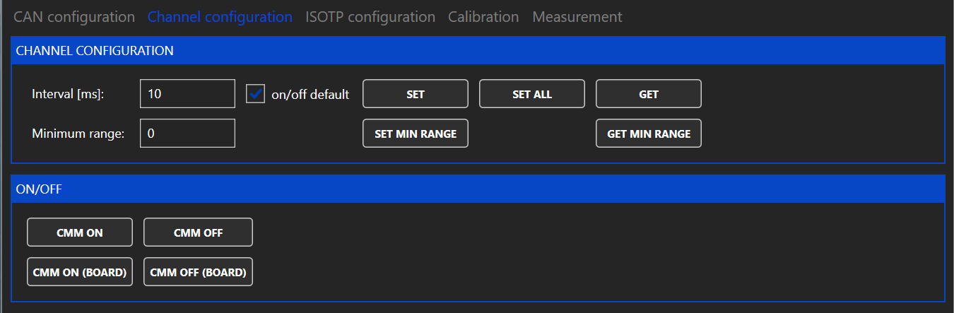 The channels of the CMM-xCH can send a cyclic CAN message with the measured values. Under "CHANNEL CONFIGURATION" the interval of these cyclic CAN messages can be adjusted. If the interval is set to zero, no cyclic CAN message are sent.