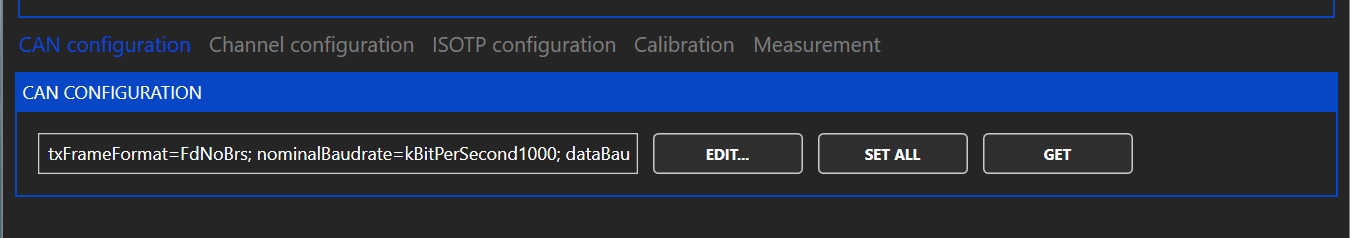The FDCAN settings are used for the internal communication and normally the default setting can be used. If the settings were changed before, the "EDIT" button can be used to select the changed settings. If the settings are unknown the "DETECT CAN BAUDRATE" button can be used.