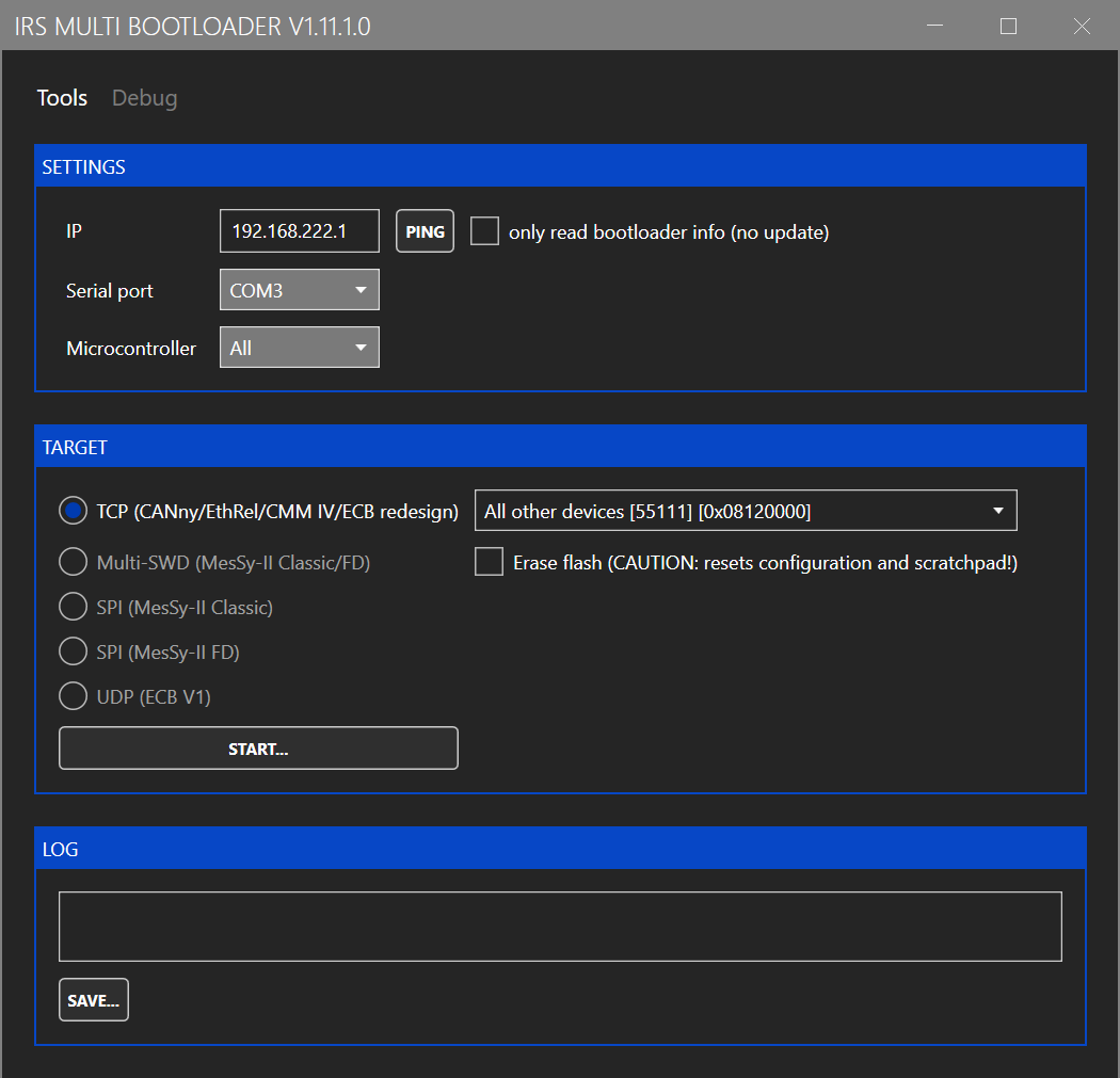 Enter the IP address and click on "START". Select the firmware image in the file selection dialog. The firmware image is include in the folder "firmware" of the GUI installation folder and named "STM32H7-Gateway.tinyimg2".