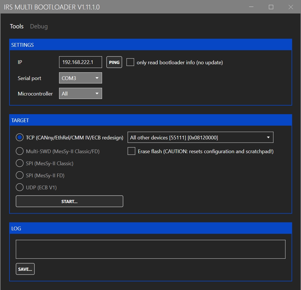 To update the Ethernet-CAN-Gateway firmware, use "Tools -> Bootloader Gateway". This opens the following window: